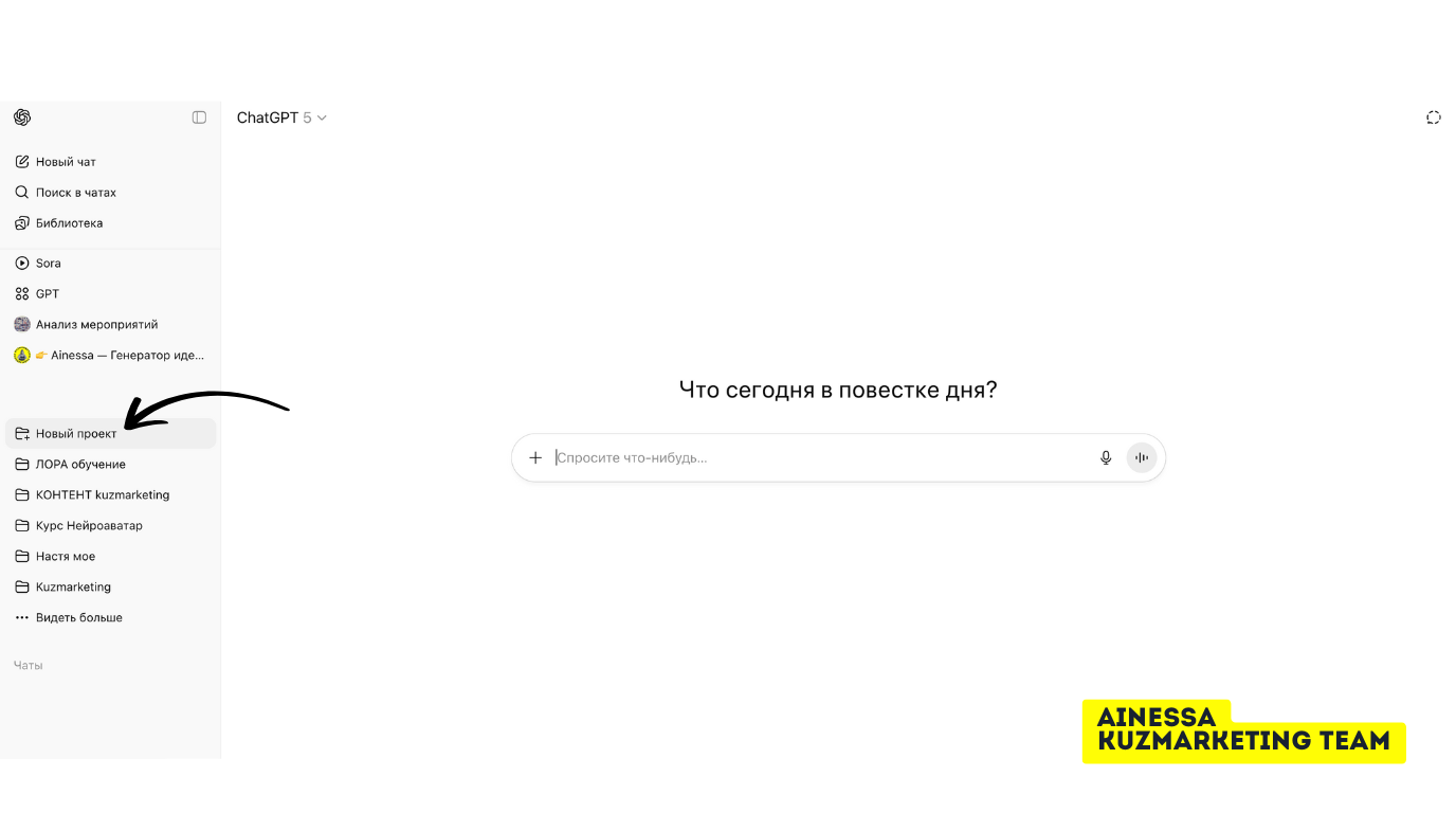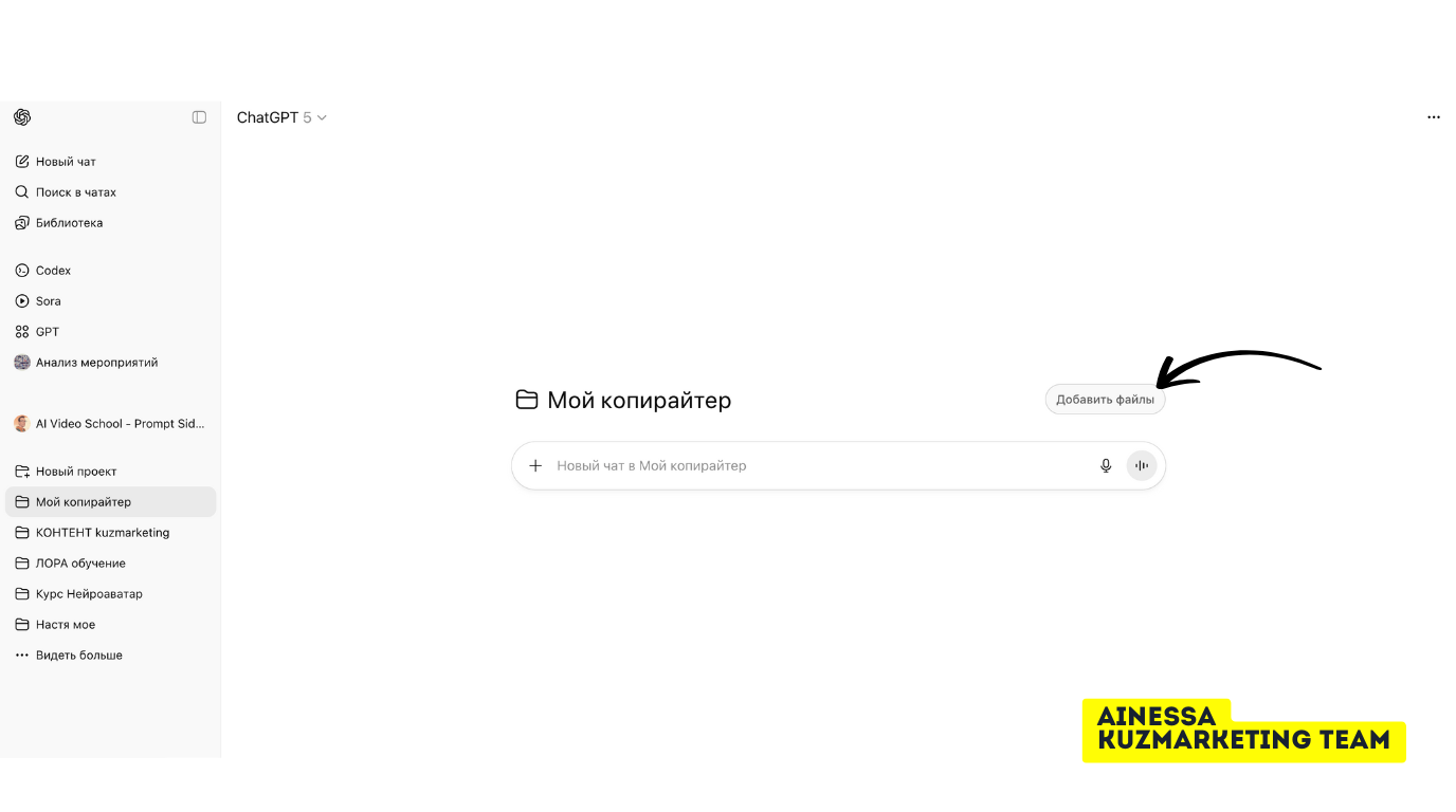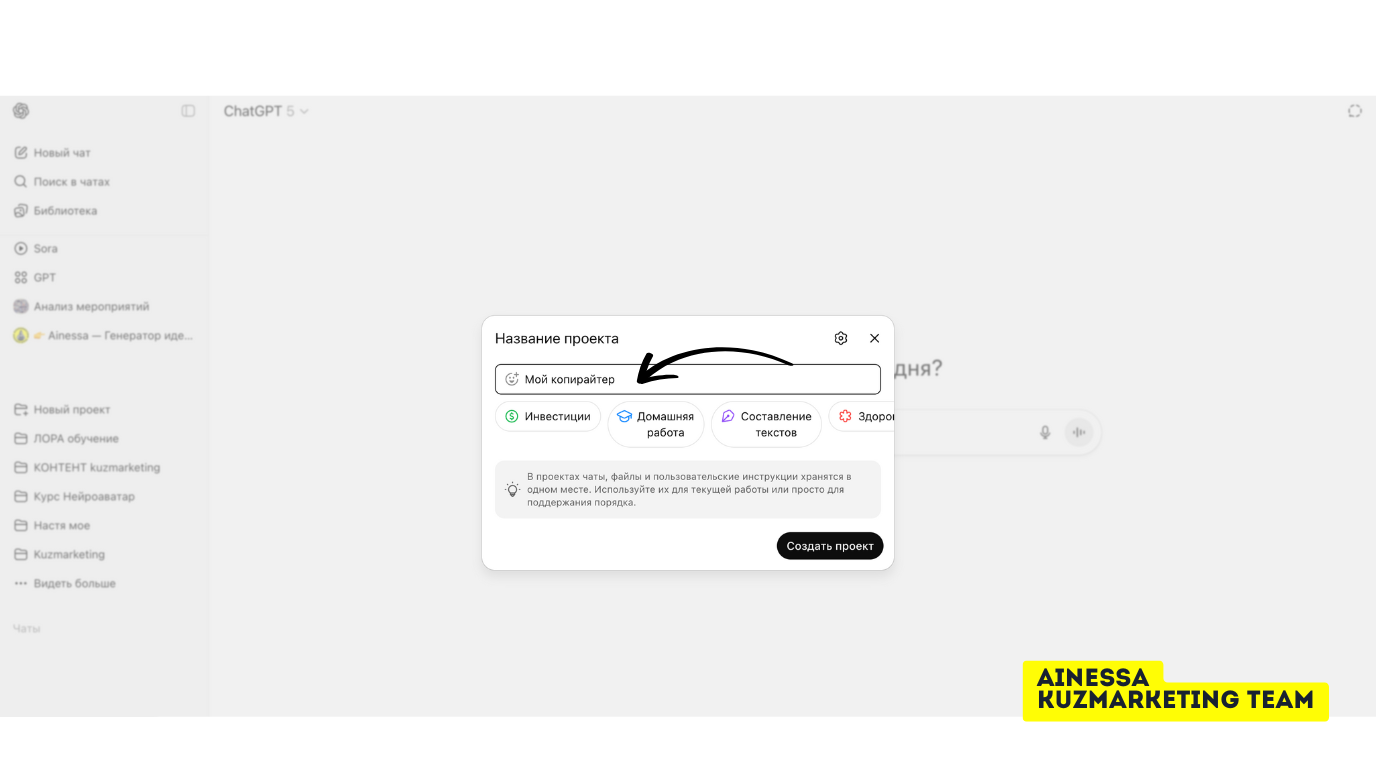 С самого начала создай новый проект (или папку) «Контент». Туда будем складывать всё важное: твои лучшие тексты, «капсулу стиля», мини-редполитику и рабочие шаблоны. Любые чаты, которые ведёшь в рамках этого проекта, будут опираться на эти материалы.