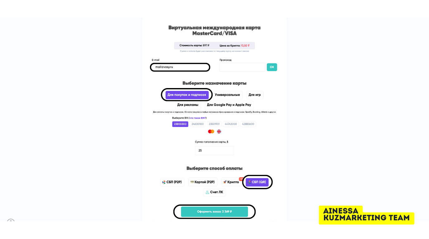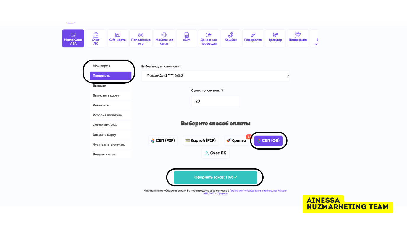Выбираем нужную карту → указываем сумму (например, $20) → способ оплаты (я взял СБП (QR)) → «Оформить заказ».